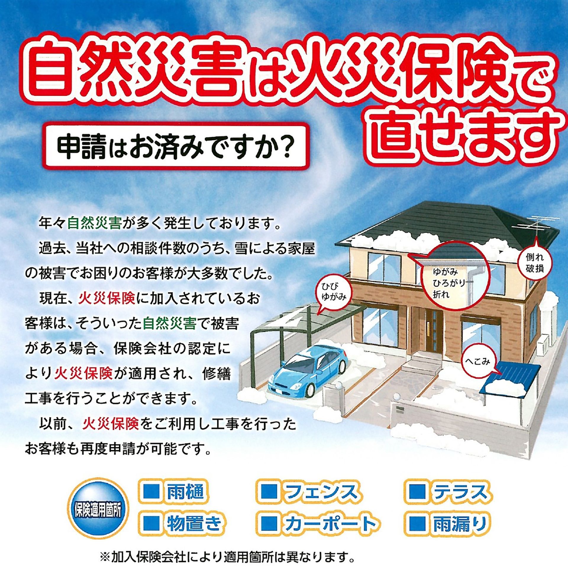大雪などの自然災害により家屋に被害があった際、火災保険が適用される場合がございます。